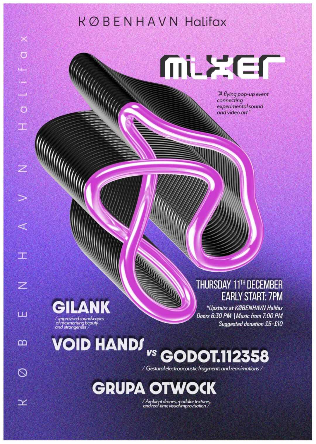 A night of experimental sound and live visuals in the upstairs room at KØBENHAVN Halifax, Thursday, 13th December.